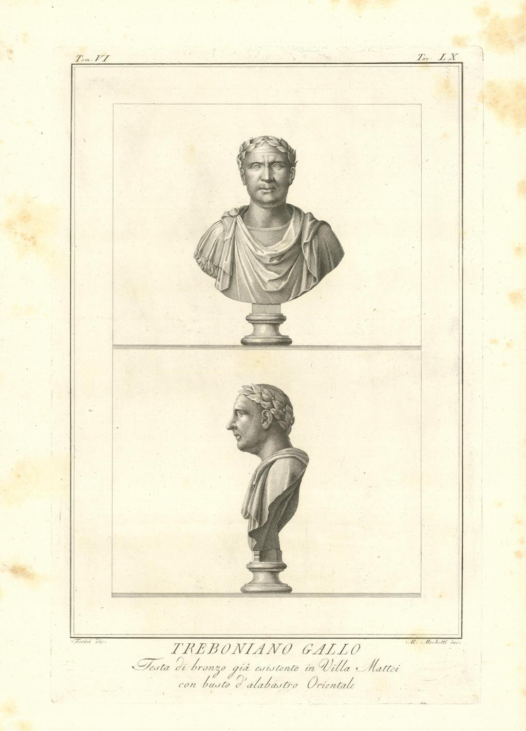 Il presente busto coronato ritrae Gaio Vibio Treboniano Gallo (Perugia, 206 – Terni, 253) imperatore romano dal 251 al 253 insieme al figlio Volusiano. Il suo regno fu caratterizzato da una lunga serie di disastri, come la peste che colpì Roma per anni e le incursioni delle popolazioni barbare oltre i confini dell'impero. Inserita nell'opera "Il Museo Pio-Clementino descritto da Ennio Quirino Visconti Direttore del Museo Capitolino - Tomo sesto - Dedicato alla Santita di Nostro Signore PIO SESTO Pontefice Massimo. Edito da Luigi Mirri / Mercante di quadri incontro il Palazzo Bernini. In Roma MDCCXCII con Privilegio Pontificio. Opera dedicata ai Busti del Museo Pio-Clementino. Leggeri segni di foxing