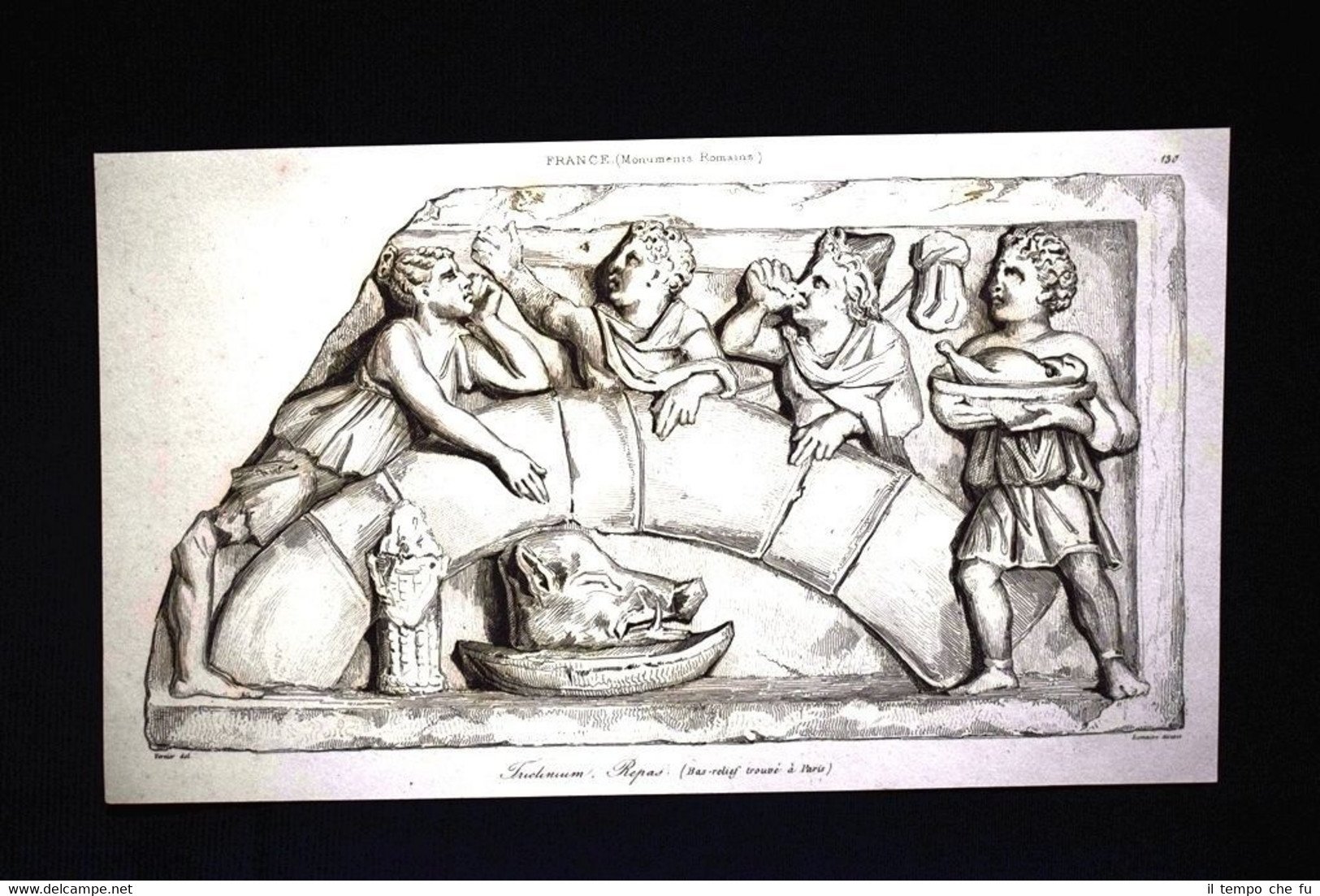 Incisione su acciaio Stampata su carta non retroscritta Estratta da pubblicazione del 1850. .incisione che ha quindi oltre 166 anni! Tavola facente parte della rara opera pubblicata in Parigi del 1850 "L'Univers Pittoresque" Autore: M.Ph. Le Blas Editore: Firmin Didot Triclinium, Repas (Basrelief trouvé a Paris) France UP-026 Dimensioni Cm 20,00 x 11,00 Qualora vogliate delle scansioni migliori contattateci, soddisferemo ogni vostra richiesta PaypalCarta di creditoBonifico bancario Accuratamente adagiate su un cartoncino e protette da pellicola trasparente rigida,il tutto viene inserito dentro plico di adeguate dimensioni per proteggerne l'integrità