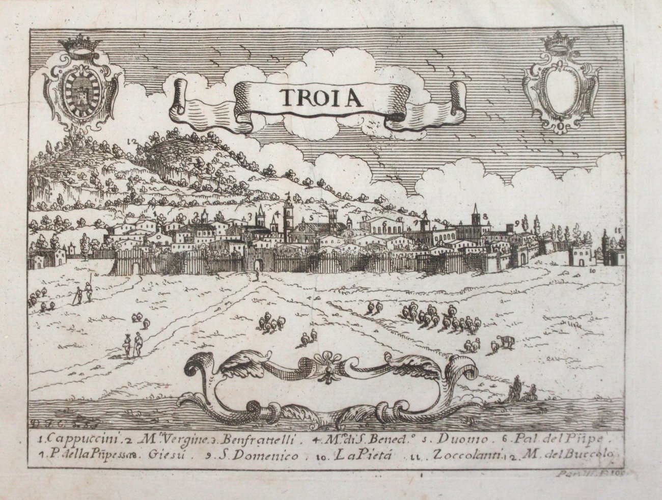 Incisione in rame, 130x170. Piacevole veduta arricchita da titolo su nastro e bel cartiglio, con richiami nella parte inferiore; tratta da " Il Regno di Napoli in prospettiva". Bell'esemplare con qualche minima piega.