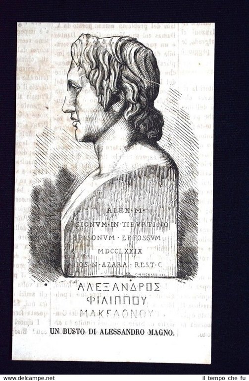 Rara incisione estratta da pubblicazione del 1868. .incisione che ha quindi oltre 150 anni! Un busto di Alessandro Magno Dimensioni Cm 10,00 x 16,00 EP1868 - 002 Qualora vogliate delle scansioni migliori contattateci, soddisferemo ogni vostra richiesta. Paypal Carta di credito Bonifico bancario Accuratamente adagiate su un cartoncino e protette da pellicola trasparente rigida, il tutto viene inserito dentro plico di adeguate dimensioni per proteggerne l'integrità.