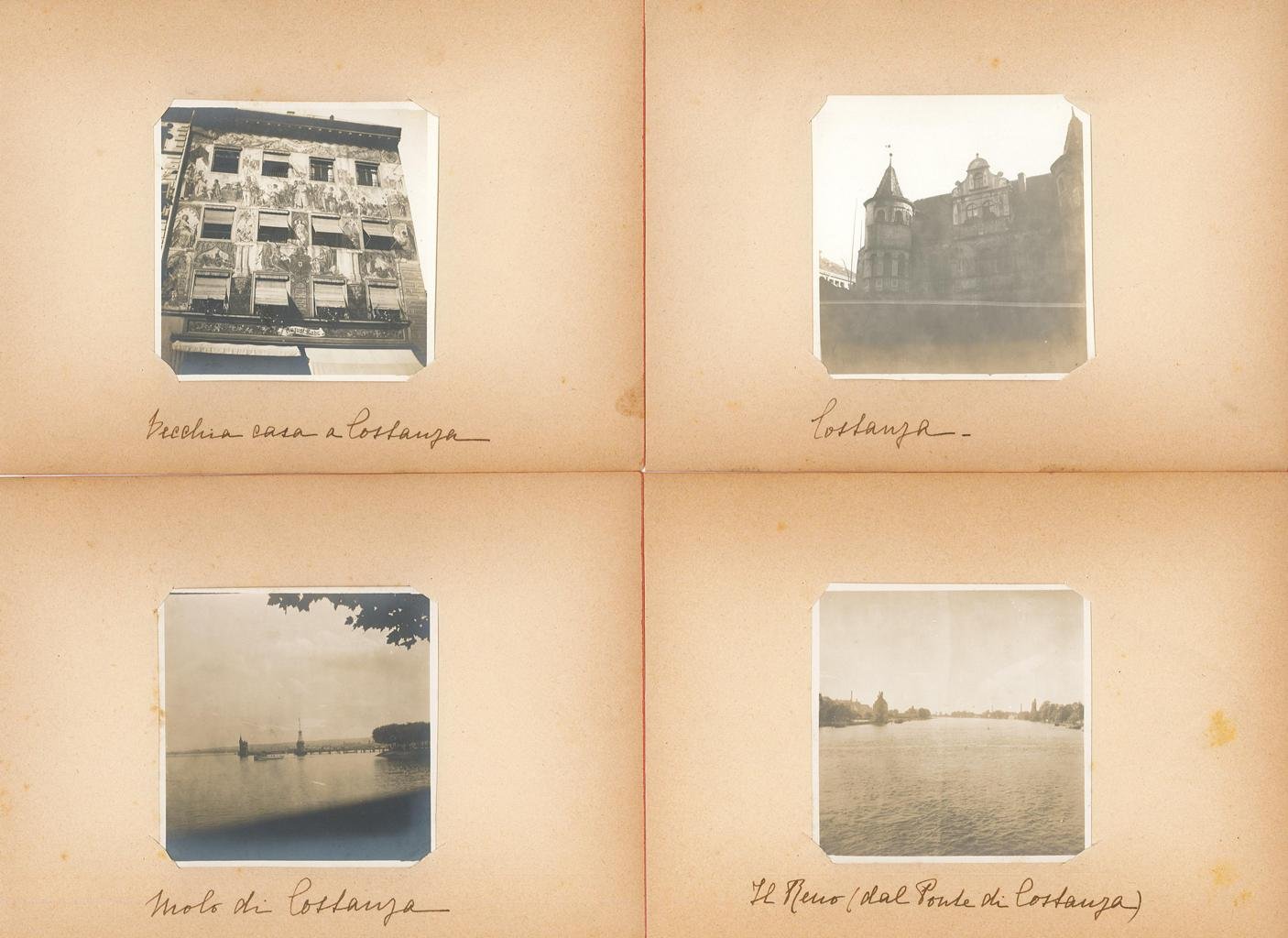 Serie di quattro fotografie, anchiche ed originali, montate su vecchio cartoncino editoriale coevo (cm 15x20), titoli scritti a mano con inchiostro bruno. Autore: anonimo. Luogo: Costanza - Konstanz. Anno: 1923. Tecnica: fotografia all'albumina. Dimensioni: 90x90 mm