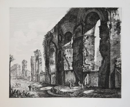 LE ANTICHITA ROMANE Tavola tratta dalla serie delle Antichità Romane, composta di 101 tavole, che viene realizzata con il ricavato della e vendita dei rami della Raccolta di cinquanta principali vedute di antichità tratte da scavi fatti in Roma in questi ultimi tempi divise in 40 vedute, edita nel 1817. Con quest’opera, per il numero delle tavole e per il formato prescelto, di grandi dimensioni, l’incisore vuole affermarsi come figura di primo piano nel mondo artistico romano. In quest’opera Rossini si cimenta in un diretto confronto con il suo predecessore G. B. Piranesi che costituisce un punto di riferimento per un incisore di vedute antiche per quanto riguarda l’originalità e l’ampiezza della riproduzione. Il Rossini, oltre a sottolineare la sua influenza nella scelta del titolo e di alcune didascalie, usa frequentemente le medesime inquadrature e identici punti di vista del maestro veneziano. Altro elemento riconducibile a Piranesi è l’uso della luce e dei forti contrasti chiaroscurali. La volontà di voler animare le vedute, restituendo il monumento al suo contesto storico e la propria inadeguatezza nel campo della figura, porta Rossini ad una collaborazione con Bartolomeo Pinelli, incisore romano, interprete e illustratore del costume e della vita popolare; a cui si devono le figure e i gruppi caratteristici che corredano le vedute. Pinelli, in alcuni casi, riprende i motivi tratti dalle sue precedenti raccolte di Costumi pittoreschi romani. ' Acquaforte, impressa su carta coeva, in ottimo stato di conservazione. ROMAN ANTIQUITIES A nice view taken from the Antichità Romane, set of 101 plates, realized with the proceeds of the sale of the plates used for Raccolta di cinquanta principali vedute di antichità tratte dai scavi fatti in Roma in questi ultimi tempi […], published in 1817. This is the work with which the artist wanted to become one of the most important artists in the Roman cultural life; we can state that if we consider the size of the work and the subject he choose. In this work Rossini tested himself with his predecessor, G. B. Piranesi, who was considered as a point of reference when it came to ancient views and originality. Rossini, was deeply influenced by Piranesi, as it can be seen in the title, the legends, the same points of views and framing. Another important element he took from Piranesi is the use of light and the contrast of chiaroscuro. In these plates Rossini reached the higher mastery of the technique, realizing also extremely particular framings and a new and complex organization of the space. In the plates quite common is the diagonal view of the subject, which gave him the possibility to elaborate more the chiaroscuro. The will to give life to his views, the reinstatement of the monuments to their historic context and the fact that he was not good with figures, brought Rossini to start a partnership with Bartolomeo Pinelli, Roman engraver and costume illustrator of daily life. He was the one who realized the figures of Rossini’s views. Sometimes Pinelli took the subjects from his previous collection Costumi pittoreschi romani. ' Etching, printed on contemporary paper, in very good condition. Cfr. Luigi Rossini incisore. Vedute di roma 1817 - 1850, catalogo della mostra a cura di L. Gavazzi, M. E. Tottoni, Roma Palazzo Braschi, 7 aprile - 15 luglio 1982. Roma