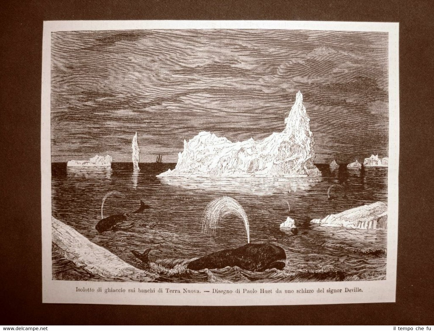 Veduta di balene e di un isolotto di ghiaccio sui banchi di Terra Nuova del 1863