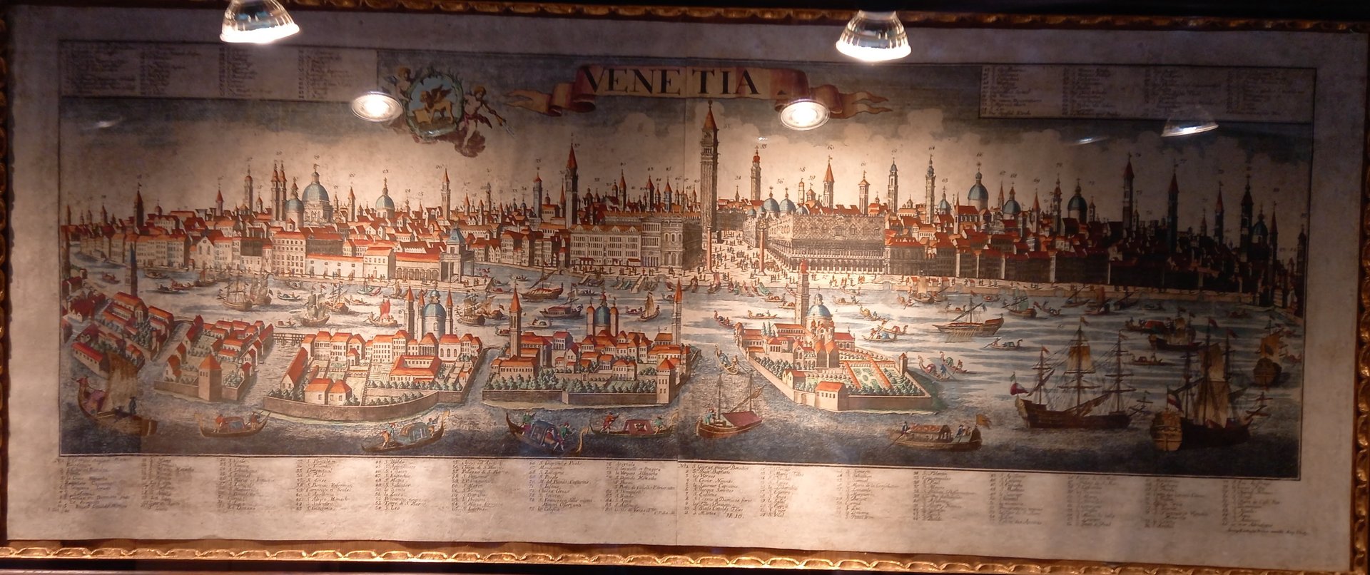 Incisione in rame su due lastre, compl. 370 x 1021 cm. I/II stato (in basso a destra la scritta Georg Balthasar Probst, haeres Ierem: Wolfy exc. Aug Vind). Acquarellatura probabilmente d'epoca. In alto a destra, entro grande nastro "VENETIA". Sotto a sinistra: F. B. Wernr delin.". Friedrich Bernhard Werner (1690-1776) disegnatore e pittore. Eseguita su disegno del Werner è una seconda edizione della veduta edita da Georg Balthasar Probst nel 1730. Le uniche differenze sono nella traduzione in tedesco e latino dei rimandi, inseriti in questa nuova edizione e nella disposizione di alcune imbarcazioni in primo piano. Iohan Friedrich ereditò l'attività dal padre Georg, che a sua volta l'aveva ereditata da Geremia Wolff. Moretto n 156; Schulz (1970) n 193; Cassini (1971) n 79. Romanelli, Biadene (1982), n 80.Copper engraving on two plates, compl. 370 x 1021cm. I/II state (bottom right the inscription Georg Balthasar Probst, haeres Ierem: Wolfy exc. Aug Vind). Probably period watercolor. Top right, within large ribbon "VENETIA". Below left: F. B. Wernr delin.". Friedrich Bernhard Werner (1690-1776) draftsman and painter. Executed on a drawing by Werner is a second edition of the veduta published by Georg Balthasar Probst in 1730. The only differences are in the German translation and of the references, inserted in this new edition and in the arrangement of some boats in the foreground. Iohan Friedrich inherited the business from his father Georg, who in turn had inherited it from Geremia Wolff. Moretto n 156; Schulz (1970) n 193; Cassini (1971) n 79. Romanelli, Biadene (1982), n 80.