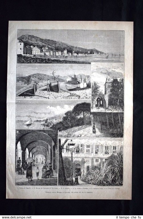 Rara incisione estratta da pubblicazione del 1882. .incisione che ha quindi oltre 136 anni! Vedute di Rapallo, sulla Riviera di Levante 1. Veduta di Rapallo 2. Rovine del Convento di Val Cristi 3. Il Castello 4. La strada a Portofino 5. Industria locale 6. Hotel de l'Europe Dimensioni Cm 25,00 x 35,00 EP1882 - 070 Qualora vogliate delle scansioni migliori contattateci, soddisferemo ogni vostra richiesta. Paypal Carta di credito Bonifico bancario Accuratamente adagiate su un cartoncino e protette da pellicola trasparente rigida, il tutto viene inserito dentro plico di adeguate dimensioni per proteggerne l'integrità.