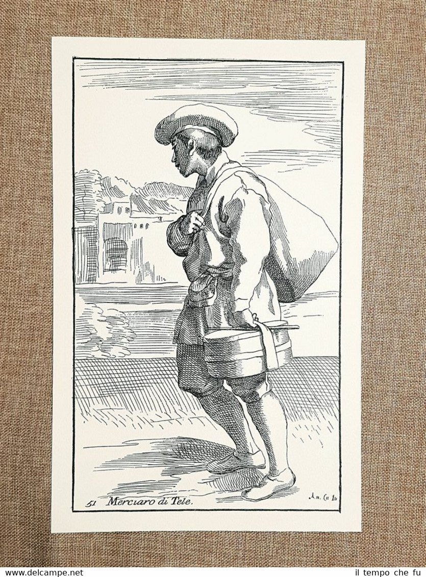 Venditore di tele Arti Bologna Tavola di Annibale Carracci 1646 Costume Ristampa Rara tavola estratta da pubblicazione di metà del '900Stampata su carta speciale e non retroscritta Merciario o venditore di tele Antico mestiere Moda e costume Estratta da Le arti di Bologna di Annibale Carracci del 1646 Ristampa Codice articolo: VIP-155Dimensioni: Cm 18,00 x 29,00