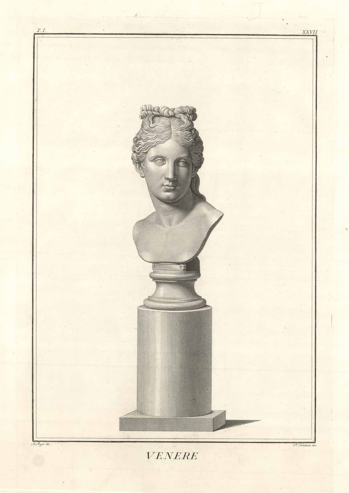 Incisione raffigurante Venere inserita nel tomo primo dell'opera "Il Museo Chiaramonti aggiunto al Pio-Clementino da N. S. Pio VII P. N." Pubblicata da Antonio d'Este e Gaspare Capparone a Roma nel 1808. Busto giovane dai bei lineamenti mostrano la dea della bellezza con crine raccolto sulla sommità. Autore: Pozzi A. dis. & Fontana P. inc. Luogo: Venere. Anno: 1808. Tecnica: incisione in rame. Dimensioni: 620x430 il foglio.