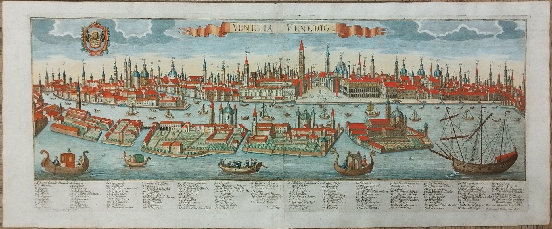 Incisione in rame su due lastre di mm 263 x 663 in perfetta coloritura d'epoca. Buoni margini esterni alla battuta, foglio senza difetti. In alto entro lungo nastro "Venetia - Venedig" sotto 66 toponimi in italiano e tedesco con indicazione degli edifici sacri. Veduta prospettica di Venezia, di grande rarità, che riprende, in dimensione più modeste, la grande stampa del Probst del 1730. Moretto 165. Cassini 77. Romanelli Biadene 78. (EN) Copper engraving on two plates measuring 263 x 663 mm in perfect period colouring. Good margins outside the rebate, sheet without defects. At the top within a long ribbon "Venetia - Venedig" under 66 toponyms in Italian and German with indication of the sacred buildings. Perspective view of Venice, of great rarity, which takes up, in a more modest size, the large print by Probst of 1730. Moretto 165. Cassini 77. Romanelli Biadene 78