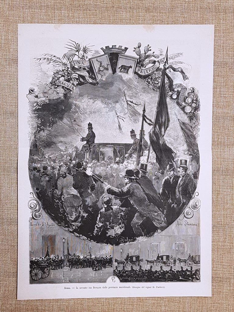 Viaggio Re Umberto I di Savoia Regina Margherita Sicilia nel 1881 Ritorno Roma Rara incisione estratta da pubblicazione del 1881 Il viaggio di Re Umberto I di Savoia e della Regina Margherita in Sicilia nel 1881 Il ritorno a Roma Codice prodotto: II1881-039 Dimensioni: Cm 24,00 x 34,00