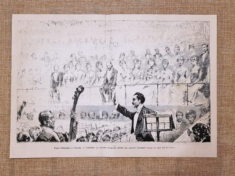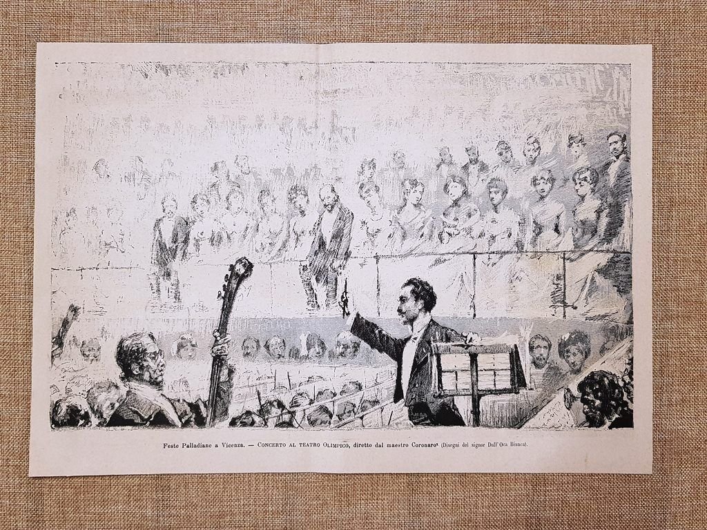 Vicenza 1880 Feste Palladiane Concerto Teatro Olimpico Coronaro Palladio Bianca Rara stampa Estratta da pubblicazione del 1880 Vicenza nel 1880 Feste Palladiane Il concerto al Teatro Olimpico Dirige il Maestro Coronaro Palladio Disegno di Dall'Oca Bianca Codice articolo: II1880-061� Dimensioni: Cm 23,00 x 33,00