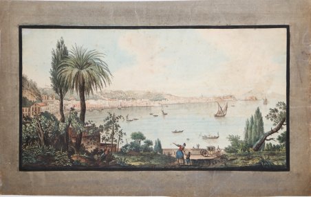 Veduta tratta dal celebre Campi Phlegraei. Observations on the Volcanos of the two Sicilies as They have been communicated to the Royal Society of London. Il diplomatico e archeologo britannico sir William Douglas Hamilton (1730-1803), fu, tra il 1764 e la fine del XVIII secolo, ambasciatore inglese presso la corte di Napoli. Appassionato vulcanologo, tra il 1776 e il 1779 realizzò, insieme al pittore Pietro Fabris, Campi Phlegraei, un’opera monumentale in due volumi, pubblicata per la prima volta a Napoli tra il 1776 ed il 1779 con testo bilingue (inglese e francese) perché destinata ai viaggiatori del Grand Tour. Questo raffinato capolavoro figurativo del XVIII secolo è reso possibile dalla cultura e dal mecenatismo di William Hamilton, e dall'arte raffinata del pittore paesaggista Pietro Fabris, autore delle 59 magnifiche incisioni colorate a tempera. Unanimemente considerato un capolavoro editoriale ed uno dei libri più belli di tutto il Settecento, Campi Phlegraei di Hamilton sono una pietra miliare sia nel campo dell'arte dell'illustrazione, sia nell'ambito della ricerca geofisica e vulcanologica. Il nome “Campi Flegrei”, ovvero “terre bruciate dal fuoco”, indica la vasta zona che comprende Napoli e i suoi dintorni, caratterizzata sin dall'antichità da vivace attività vulcanica. Difatti, il Vesuvio, le sue spettacolari eruzioni e i luoghi che lo circondano sono i protagonisti indiscussi di questa opera. Tuttavia, l'attenta ricerca vulcanologica condotta da Hamilton coinvolse anche altri vulcani del sud Italia, in particolare quelli delle Eolie e l'Etna, cui egli volle dedicare tavole e commenti. Del modernissimo approccio di Hamilton all'indagine scientifica, che rese l'opera un testo rivoluzionario nell'ambito della vulcanologia, ci parla lui stesso nella lettera introduttiva dei Campi Phlegraei, indirizzata a Sir John Pringle, presidente della Royal Society di Londra, di cui Sir William era membro dal 1766. A differenza dei naturalisti del passato, le cui teorie erano state per lo più elaborate a tavolino, secondo Hamilton, apostolo della mentalità illuminista, la natura deve essere studiata con accurate e approfondite osservazioni dal vivo, che vanno poi raccontate nel modo più fedele e comprensibile. Quindi, il testo dei Campi Phlegraei, costituito dalla serie di lettere inviate da Hamilton alla Royal Society tra il 10 giugno 1766 e il primo ottobre 1779, è sostanzialmente una cronaca dettagliatissima delle sue numerose ascensioni al Vesuvio ed escursioni alle zone limitrofe, attraverso la quale egli registrò ogni fenomeno vulcanico degno di rilievo e pervenne all'innovativa e fondamentale conclusione che l'attività dei vulcani ha un impatto determinante sulla superfice terrestre e sul modellamento del paesaggio. Nella medesima lettera a Pringle, Hamilton descrive anche la genesi delle spettacolari tavole che adornano l'opera e la storia editoriale del libro. Fedele alla sua moderna metodologia scientifica, egli desiderava che la sua relazione fosse accompagnata da immagini che riproducessero in modo preciso e particolareggiato quanto da lui osservato. Commissionò il lavoro a Pietro Fabris, da lui definito “a most ingenious and able artist”, e gli chiese di disegnare ogni località vulcanica visitata, oltre a campioni di rocce vulcaniche e a particolari eruzioni, come quelle del Vesuvio avvenute a cavallo tra il 1760 e il 1761, nella notte del 20 ottobre 1767 e dell'11 maggio 1771, e nell'agosto 1779, che è oggetto dell'intero Supplement ai Campi Phlegraei. Hamilton supervisionò direttamente l'opera di Fabris, che lo accompagnava nelle sue escursioni. Infatti, i due uomini sono ritratti in molte tavole, il primo con un cappotto rosso, il secondo blu. Pienamente soddisfatto del lavoro dell'artista, eseguito con “the uttermost fidelity” e “as much taste as exactness”, Hamilton decise che quanto aveva inizialmente richiesto per sua personale soddisfazione fosse invece pubbl. Plate taken from Campi Phlegraei. Observations on the Volcanos of the two Sicilies as They have been communicated to the Royal Society of London. Naples: sold by Pietro Fabris, 1776-1779. Although Hamilton’s Observations on Mount Vesuvius (published by the Royal Society in 1772) was well-received at the time and ran to three editions, the Campi Phlegraei is the best known of Hamilton's four works on volcanic activity, and provided a clearer, more precise and useful explanation of volcanic activity than ever published before, which underlined Hamilton’s own theories about volcanoes being creative forces and enabled him to answer in one publication the lists of questions about volcanoes and rocks he had been receiving from correspondents all over Europe. “Its publication in French and English provided it with a market not only in his own country but throughout Europe as well, and an international audience for a British discovery” (Jenkin and Sloan). Pietro Fabris (fl.1756-1784), an artist living in Naples, was commissioned and trained by Hamilton to sketch the volcanoes of southern Italy. In four years Hamilton climbed Vesuvius at least twenty-two times, sometimes at great risk, since both he and Fabris wished to make sketches at every stage of the eruptions (the figures of Hamilton, often wearing a red coat, and Fabris, in blue, appear in the plates). The plates are so opaquely colored that the engraved base beneath is hardly visible: indeed, Hamilton himself describes them as “executed with such delicacy and perfection, as scarcely to be distinguished from the original drawings themselves” (Part I, p. 6). Hamilton then asked Fabris to undertake the publication of his letters to the Royal Society, to be illustrated by engravings after the original drawings. Fabris was the sole distributor of the work, which was originally published at 60 Neapolitan ducats for Part I and Part II; the price of the Supplement is not recorded. Copperplate with fine original colour, m