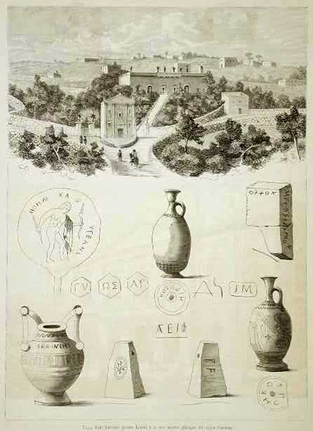 Veduta della villa, del suo museo e di alcuni reperti, in esso conservati. Testo al verso.