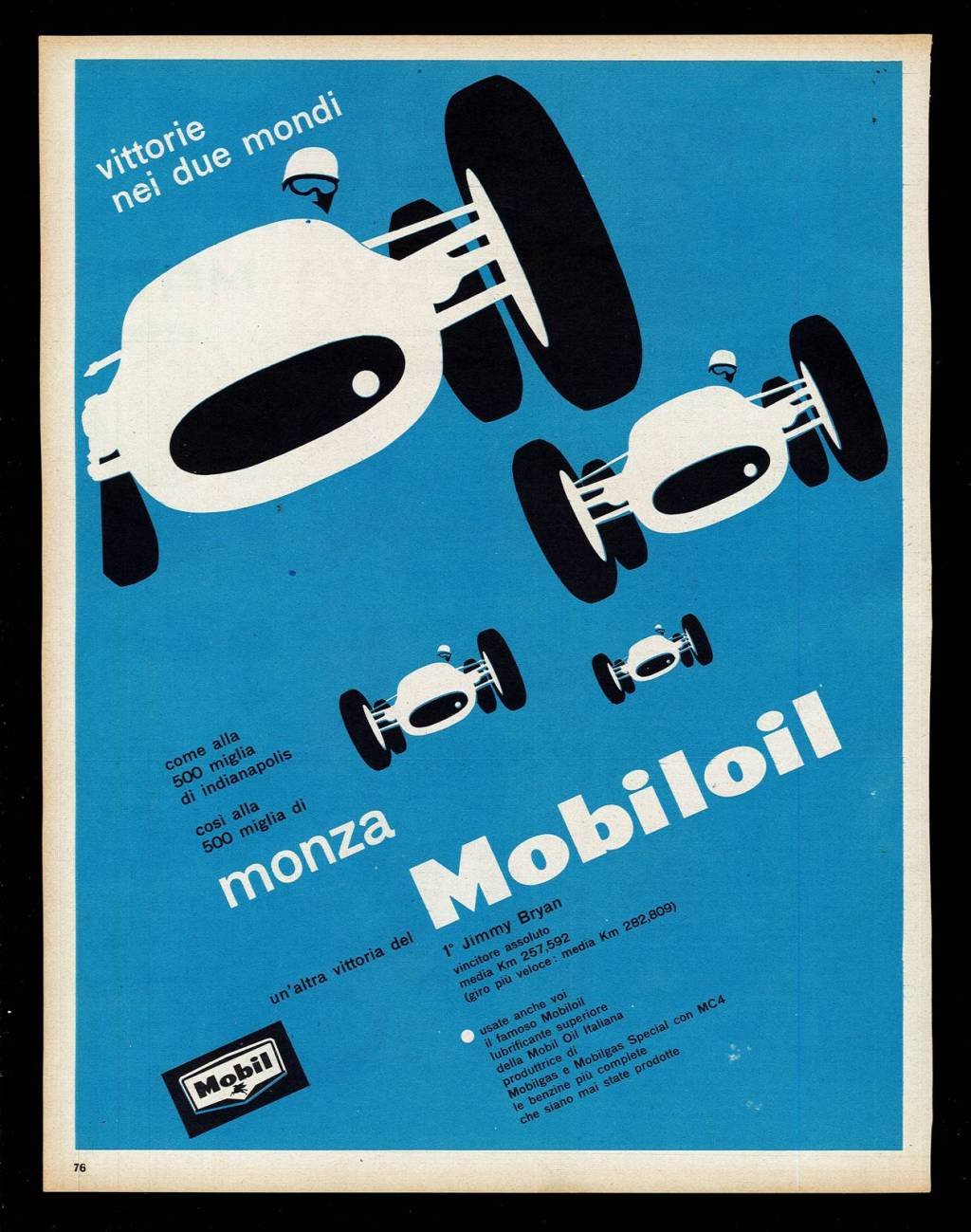 Autore: Mondadori. Luogo: Milano. Anno: 1957. Tecnica: offset. Dimensioni: 32x25. Conservazione: buone. Foglio sciolto tratto da periodico anni '50, pagina pubblicitaria Mobiloil Mobilgas. 1° classificato Jimmy Bryan 500 miglia di Monza