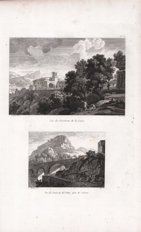 Tavola tratta dal ' Recueil de Vues et fabriques pittoresques d'Italie, Dessinées d'apres Nature, Et publiées par C. Bourgeois, Peintre. Questo album di incisioni tratte da disegni di Florent Constant Bourgeois, incisi da Guyot e Lameau, comprende per la maggior parte vedute di Roma e dei suoi dintorni (Tivoli, Marino, Subiaco, Montecassino, Anagni, Grottaferrata, Frascati, Genzano, Castel Gandolfo, ecc.), ma anche di Firenze, Pisa, Siena, Genova, Caserta e Napoli. L’opera, il cui frontespizio non fu mai stampato, uscì a dispense come raccolta di stampe e fu edita dallo stesso Bourgeois a Parigi, con indirizzo ' Mousé des Artistes, rue de Sorbonne. Incisione in rame, impressa su carta vergata coeva, piccole ossidazioni, per il resto in buone condizioni. Florent-Constant Bourgeois, detto “Bourgeois du Castelet” era originariamente un ufficiale militare. Bourgeois si dedicò esclusivamente all'arte a partire dalla metà degli anni '90, perfezionando la sua formazione nello studio di Jacques-Louis David, dove si specializzò in paesaggi e divenne soprattutto uno straordinario disegnatore; Paul Marmottan, nella sua "Ecole française de peinture, 1789-1830", fa riferimento alla sua " ' grande pureté de style et l’exécution brillante de ses dessins, la plupart très remarquables, notamment ceux au lavis". Molto ricercato e apprezzato durante la sua vita, Bourgeois ha ricevuto numerosi premi e riconoscimenti artistici, una casa al Louvre e la Legion d'onore nel 1827. Viveva al numero 3 di quai Malaquais a Parigi. La sua attività di pittore è oggi meno conosciuta, eppure espose quadri in quasi tutti i Salon dal 1791 al 1830, con solo vedute dell'Italia per il periodo dalla Rivoluzione al Consolato. Bibliografia Brunet I, 1178; Cohen I, 183; Graesse, I 512. Plate taken from the ' Recueil de Vues et fabriques pittoresques d'Italie, Dessinées d'apres Nature, Et publiées par C. Bourgeois, Peintre. This album of engravings taken from drawings by Florent Constant Bourgeois, engraved by Guyot and Lameau, includes mostly views of Rome and its environs (Tivoli, Marino, Subiaco, Montecassino, Anagni, Grottaferrata, Frascati, Genzano, Castel Gandolfo, etc.), but also of Florence, Pisa, Siena, Genoa, Caserta and Naples. The work, whose frontispiece was never printed, came out in handouts as a collection of prints and was edited by Bourgeois himself in Paris, with address ' Mousé des Artistes, rue de Sorbonne. Florent-Constant Bourgeois, known as "Bourgeois du Castelet," was originally a military officer. Bourgeois devoted himself exclusively to art from the mid-1790s, perfecting his training in Jacques-Louis David's studio, where he specialized in landscapes and became above all an extraordinary draughtsman; Paul Marmottan, in his "Ecole française de peinture, 1789-1830," refers to his " grande pureté de style et l'exécution brillante de ses dessins, la plupart très remarquables, notamment ceux au lavis." Highly sought after and appreciated during his lifetime, Bourgeois received numerous artistic prizes and awards, a house in the Louvre, and the Legion of Honor in 1827. He lived at No. 3 quai Malaquais in Paris. His activity as a painter is less well known today, yet he exhibited paintings in almost every Salon from 1791 to 1830, with only views of Italy for the period from the Revolution to the Consulate. Copperplate engraving, impressed on contemporary laid paper, minor oxidation, otherwise in good condition. Cfr.