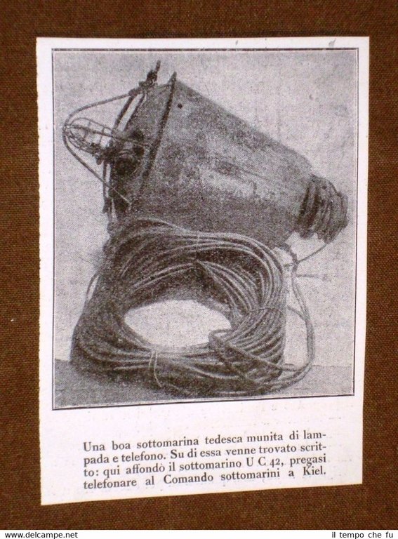 Rara stampa Estratta da Rivista d'epoca del 1918. .stampa che ha quindi oltre 95 anni! WW1 - Prima guerra mondiale del 1914-1918 Boa sottomarina della Germania con lampada e telefono Iscrizione: qui affondò il sottomarino UC 42 II1918-031 Dimensioni Cm 8,00 x 10,00 Qualora vogliate delle scansioni migliori contattateci, soddisferemo ogni vostra richiesta. PaypalCarta di creditoBonifico bancario Accuratamente adagiate su un cartoncino e protette da pellicola trasparente rigida,il tutto viene inserito dentro plico di adeguate dimensioni per proteggerne l'integrità.