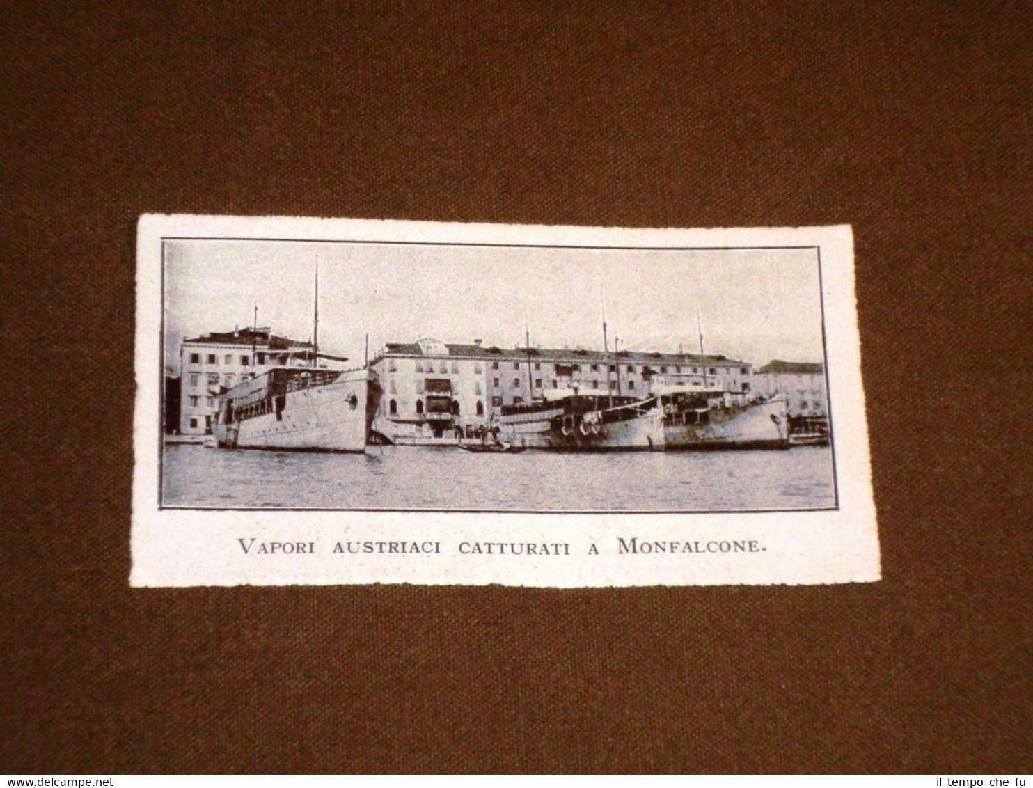 Rara Stampa Estratta da Rivista d'epoca del 1915 WW1 Prima guerra mondiale del 1914-1918 Vapori d'Austria catturati a Monfalcone II1915-037 Dimensioni Cm 9,00 x 5,00 Qualora vogliate delle scansioni migliori contattateci, soddisferemo ogni vostra richiesta. PaypalCarta di creditoBonifico bancario Accuratamente adagiate su un cartoncino e protette da pellicola trasparente rigida,il tutto viene inserito dentro plico di adeguate dimensioni per proteggerne l'integrità.