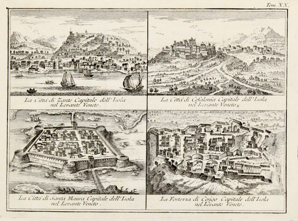 Incisione in rame, 175x235. Tratta dal XX tomo dell'opera "Lo stato presente di tutti i paesi e popoli del mondo naturale, politico, e morale…". La tavola è divisa in quattro riquadri che rappresentano le capitali fortificate delle quattro isole del Levante veneto. Buon esemplare con tracce delle pieghe editoriali.