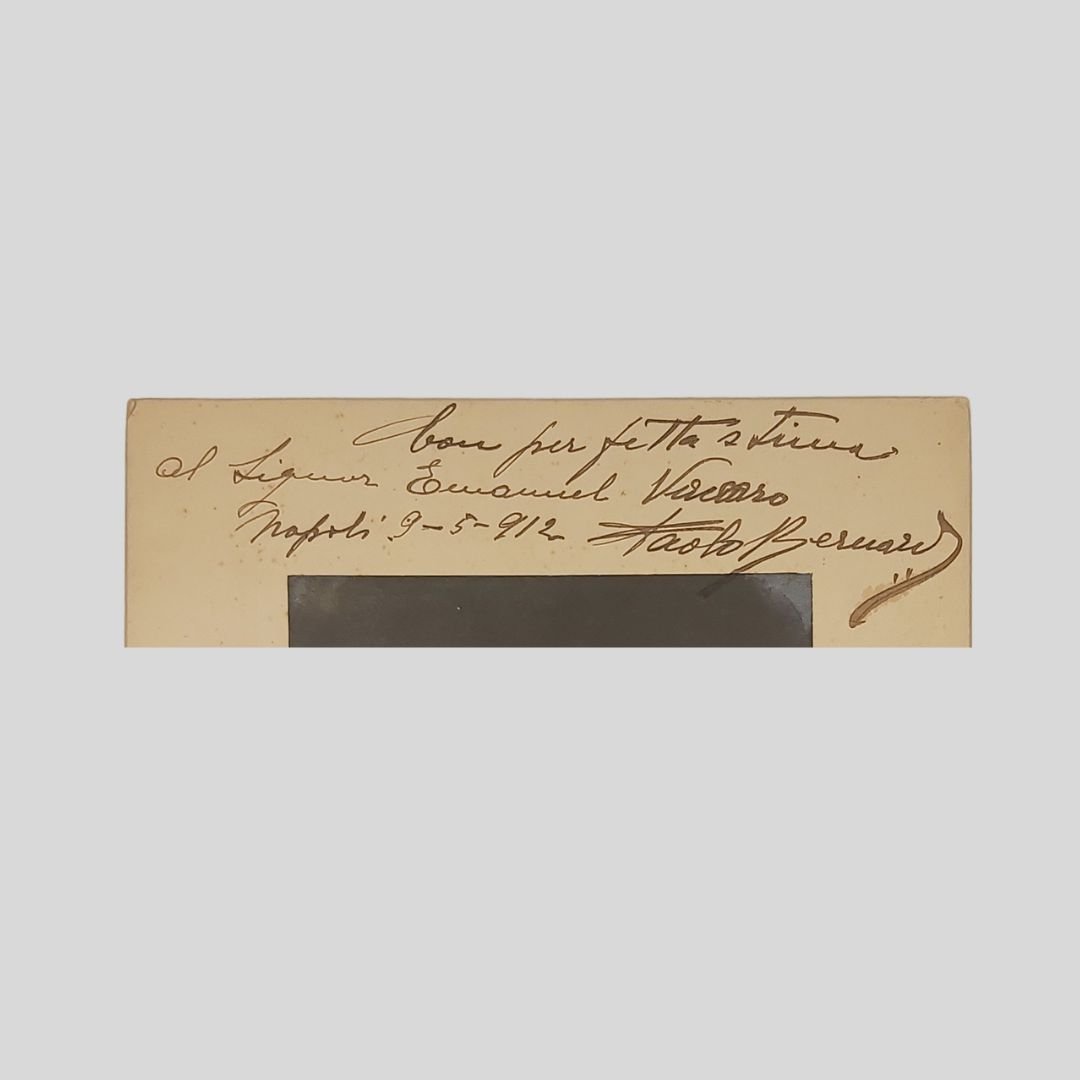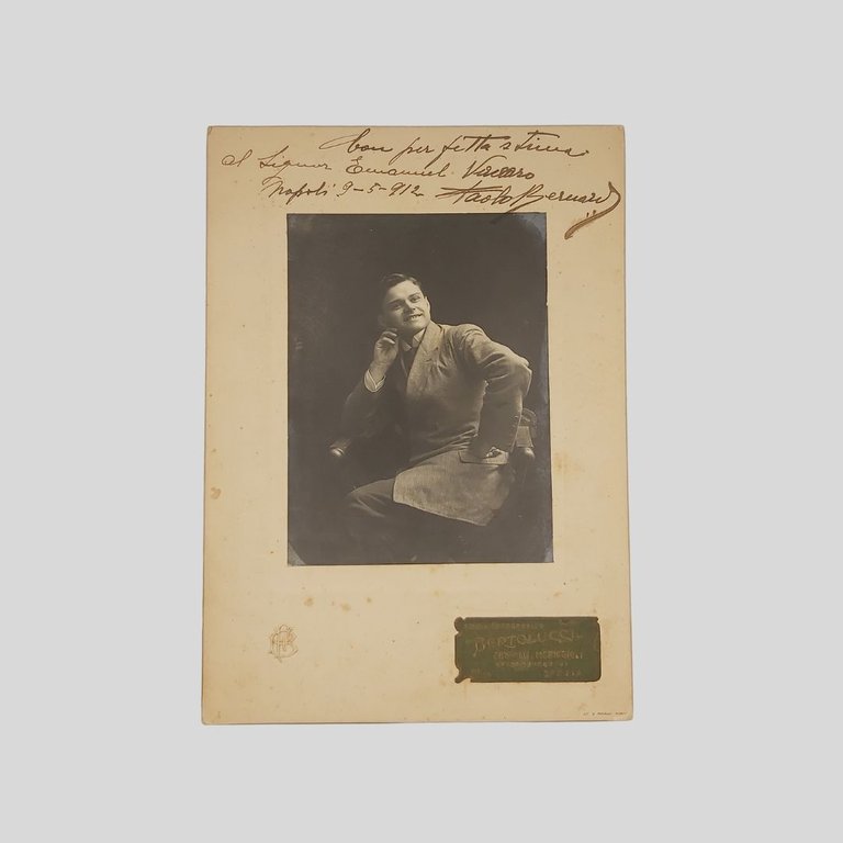 Fotografia ai sali d’argento dello Studio fotografico Bertolucci di La Spezia, montata su supporto in cartone color crema, dimensioni cm 11×14,5 (fotografia), cm 17,2×24,5 (supporto). Dedica a inchiostro marrone. Al margine inferiore timbro a secco del fotografo e relativa etichetta. Eccetto naturali “segni” del tempo, in buone condizioni. Esemplare unico, raro e ricercato. Fotografia autografa originale di Paolo Bernard, cantante di primo piano del panorama musicale italiano dei primi del Novecento. Lo scatto, di forte impatto espressivo e qualità formale, ritrae l’artista in posa elegante e riflessiva, secondo il gusto ritrattistico d’atelier dell’epoca. La fotografia è autografata e dedicata di suo pugno, con iscrizione manoscritta: «Con perfetta stima al Signor Emanuel Vaccaro – Napoli 9-5-1912» Paolo Bernard, pseud. di Paolo Belfiore. (Garlasco, 1885-Torino 1961), è stato un cantante, attore e macchiettista, entrato nella storia della musica leggera italiana per aver lanciato nel 1926 la notissima canzone Adagio Biagio. Cognato del clown Grock, si trasferì a Torino per studiare il canto lirico, iniziando nel frattempo a recitare come attore, debuttando nel 1910 al Teatro Eden con macchiette e canzoni umoristiche. Interrotta l’attività per la partecipazione alla prima guerra mondiale, riprese nel dopoguerra con il nome d’arte Paul Bernard, presto italianizzato, proponendo un repertorio in parte tradotto dal francese e in parte originale. Negli anni ’20 pubblicò molti 78 giri per la Columbia, tra cui nel 1926 il suo maggiore successo Adagio Biagio (ascolta il brano). Sono gli anni del sodalizio con Mario Bonavita (il celebre Marf) e Vittorio Mascheroni. Abbandona il mondo dello spettacolo nel 1943. Fu anche autore di canzoni in piemontese, tra cui una delle più note è Sôta i pônt del Po. Nel 1991 Biagio Antonacci ha intitolato un suo album Adagio Biagio, inserendo anche alcuni secondi, all’inizio della prima traccia, della canzone di Bernard. Lo Studio fotografico Bertolucci fu attivo nella ritrattistica artistica tra fine Ottocento e primo Novecento, specializzato in immagini destinate a editoria, spettacolo e committenza culturale. La produzione di ritratti fotografici autografi nei primi decenni del Novecento rappresenta una fonte primaria di grande rilievo per lo studio della storia dello spettacolo e della musica italiana. Fotografie come questa, firmate e dedicate dall’artista, venivano spesso destinate a colleghi, sostenitori o figure del mondo culturale, assumendo un valore che travalica l’ambito puramente iconografico. La produzione di ritratti fotografici autografi nei primi decenni del Novecento rappresenta una fonte primaria di grande rilievo per lo studio della storia dello spettacolo e della musica italiana. Fotografie come questa, firmate e dedicate dall’artista, venivano spesso destinate a colleghi, sostenitori o figure del mondo culturale, assumendo un valore che travalica l’ambito puramente iconografico.