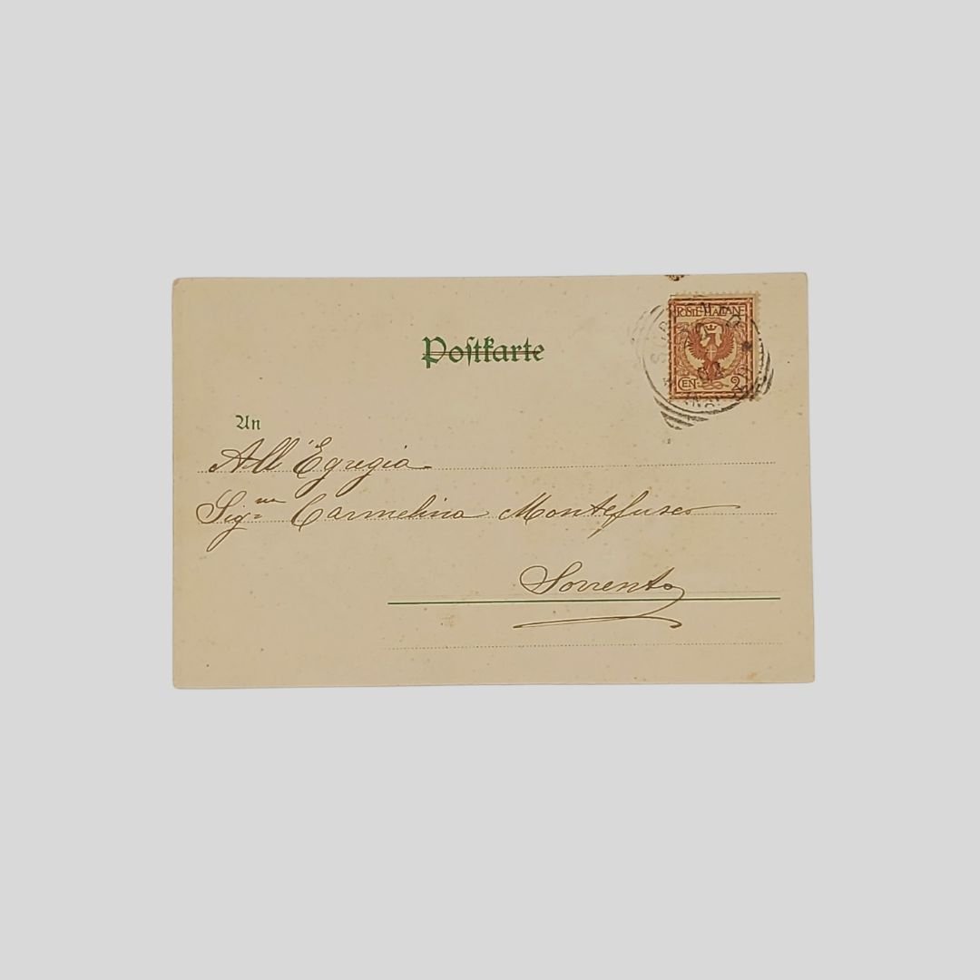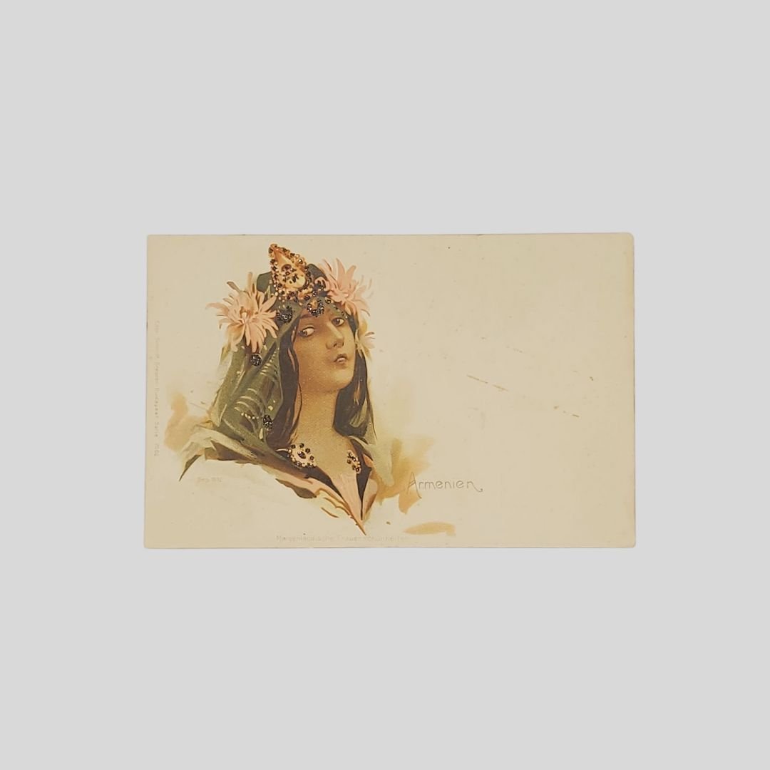 Cartolina goffrata d’epoca. Undivided back. Viaggiata, s.d. (fine ‘800), cm 14×9. Dresden-Budapest, Edizioni Edgar Schmidt (serie 7006). Francobollo, timbro. Lievi tracce d’uso. Non comune. Inserti a rilievo, acconciatura e gioielli.