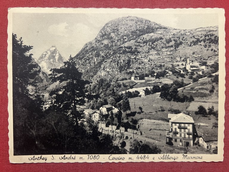 Cartolina - Antey S. André - Cervino e Albergo Marmore - 1939