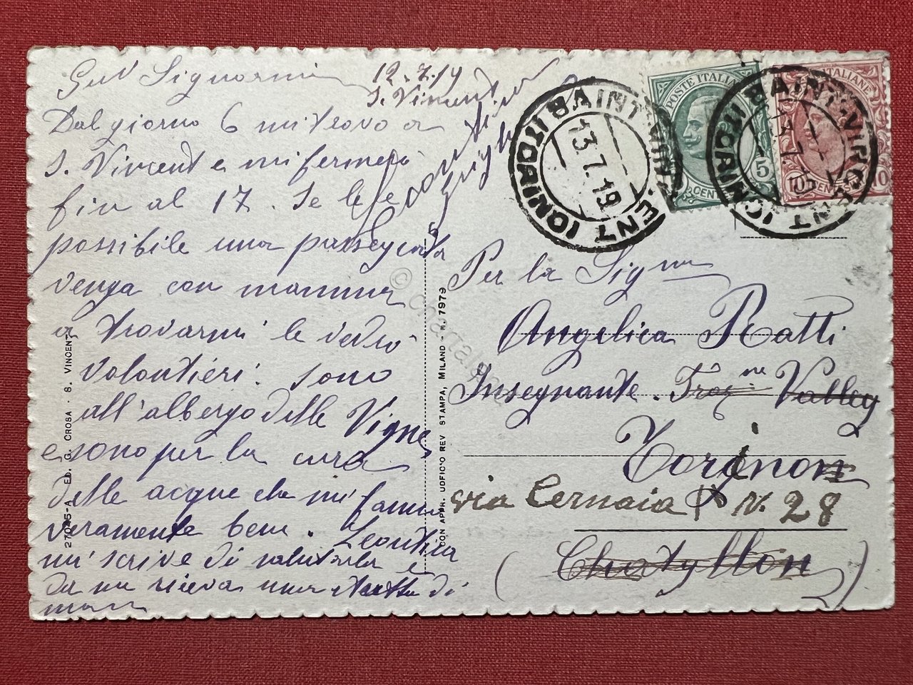 Cartolina - Chiesa Parrocchiale di S. Vincent ( Valle d'Aosta ) - 1919