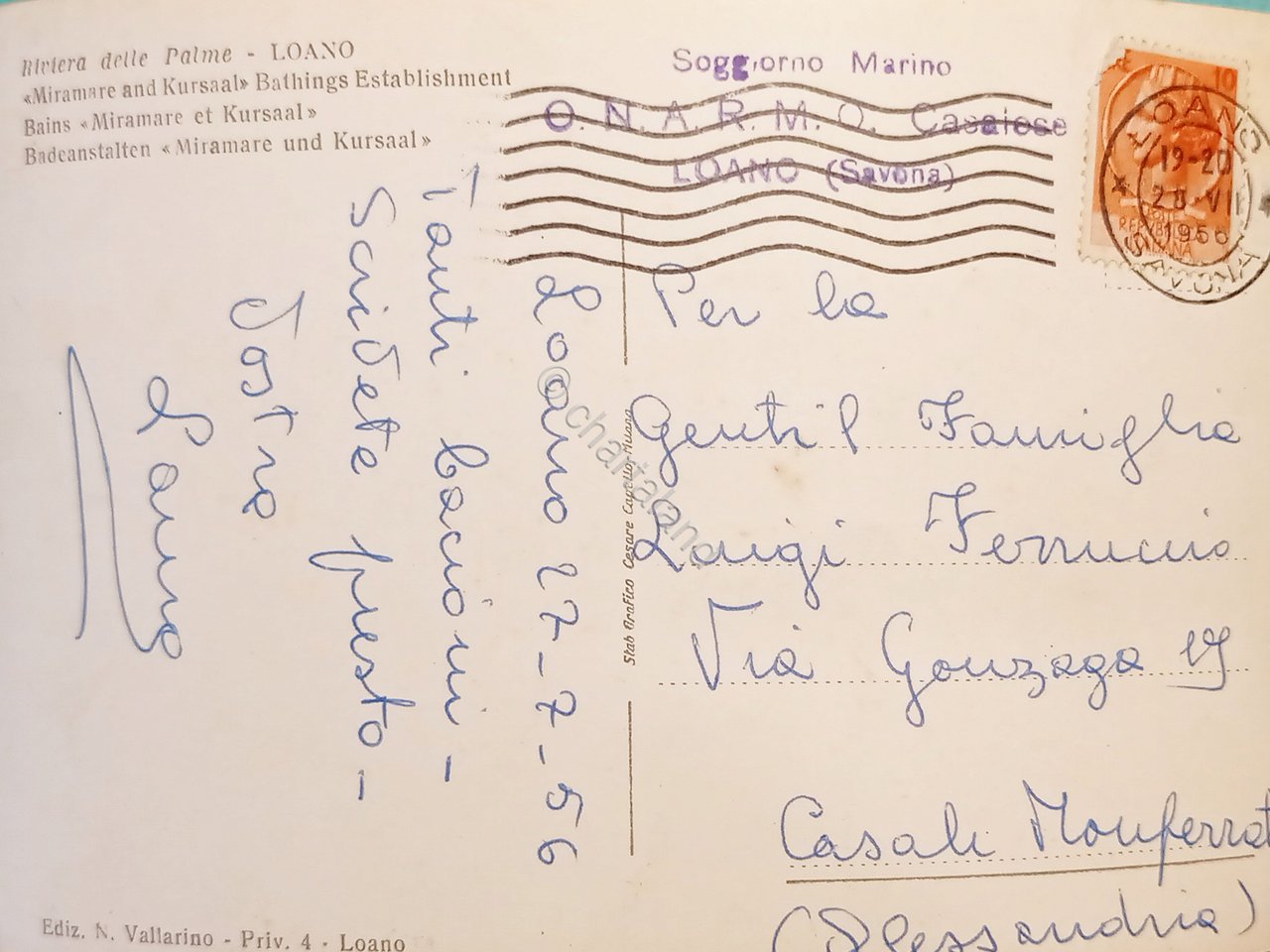 Cartolina - Riviera delle Palme - Loano - Bagni Miramare e Kursaal - 1956