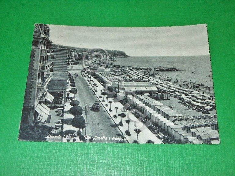 Cartolina Albisola ( Savona ) - Via Aurelia e Spiaggia 1956.