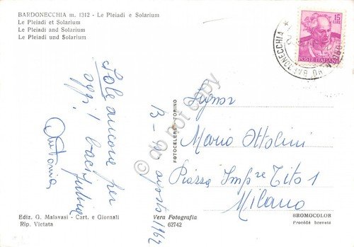 Cartolina Bardonecchia Le Peiadi e Solarium 1962 macchia