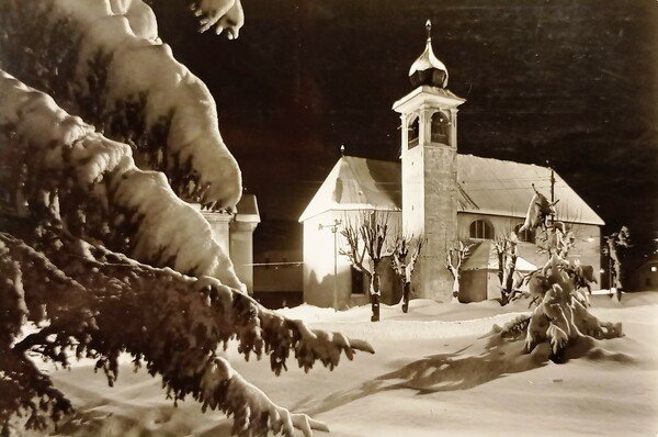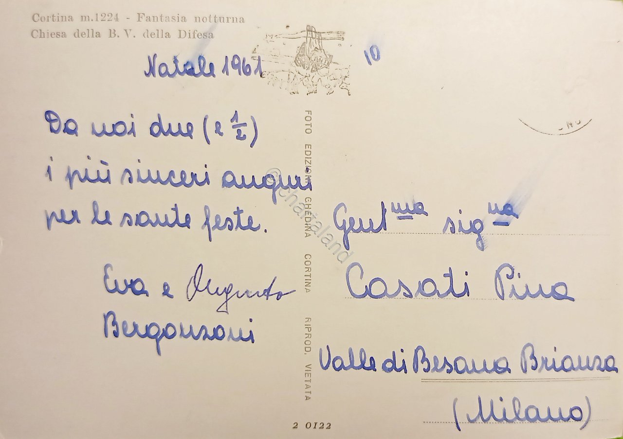 Cartolina - Cortina - Fantasia notturna - Chiesa della B. V. della Difesa - 1961
