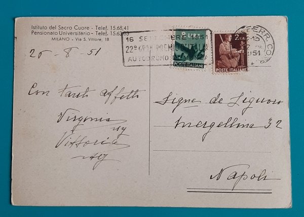Cartolina Istituto del Sacro Cuore - Pensionato Universitario - Milano - 1951