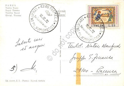 Cartolina Parma Teatro Regio animata auto Vespa 1972 timbro filatelico