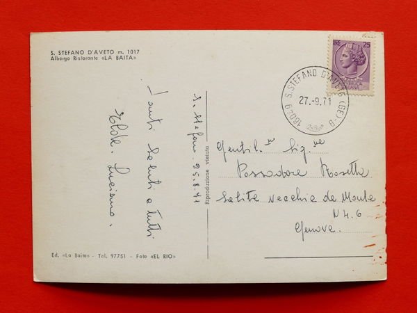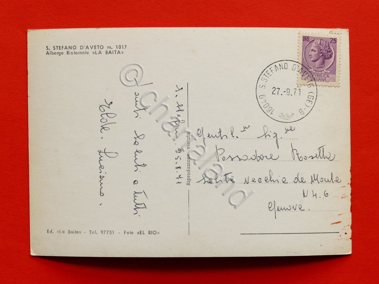Cartolina S. Stefano d'Aveto - Albergo Ristorante La Baita - 1971 1971 Cartolina formato grande - viaggiata Condizioni molto buone, come da foto Per appassionati, studiosi e collezionisti
