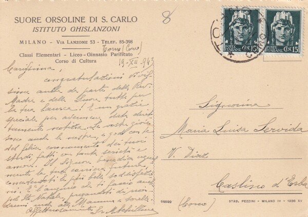 Cartolina Suore Orsoline di S. Carlo, Istituto Ghislanzoni - Cortile e chiostro lato est. Milano. 1943