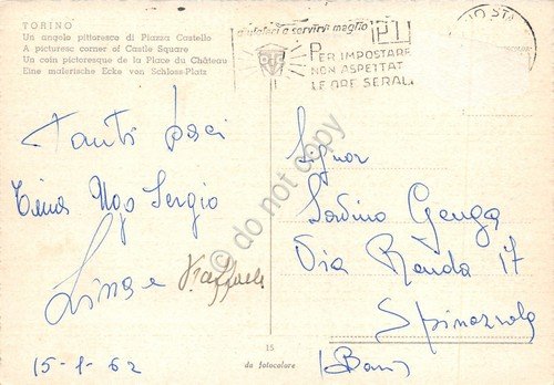 Cartolina Torino Piazza Castello 1962 timbro targhetta PT