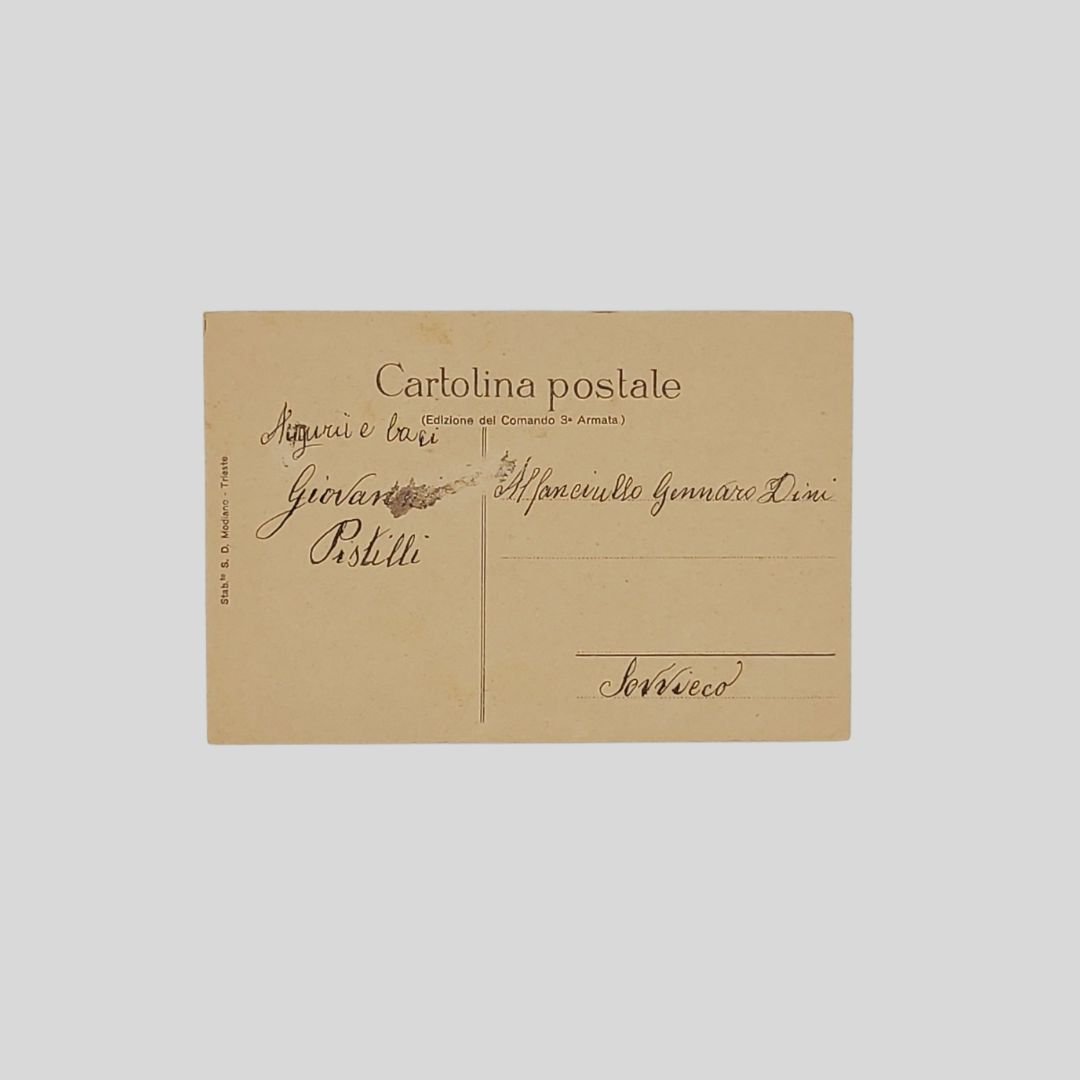 cm 9×13,5. Cartolina d’epoca. (Edizione del Comando 3 Armata). Non viaggiata, ma con invio di mano sincrona. Lievi tracce d’uso al verso.