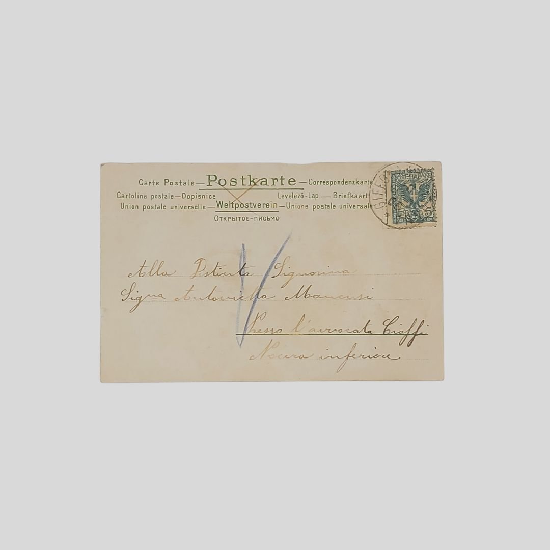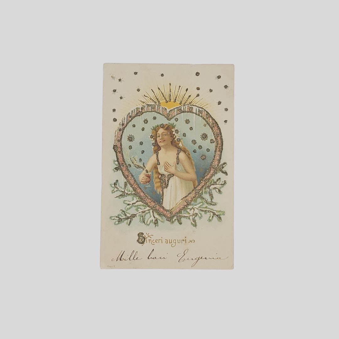 Cartolina augurale goffrata d’epoca. Undivided back. Viaggiata, s.d. (primi ‘900) cm 9×14. Francobollo, timbro. Piccolissimo strappo al margine superiore