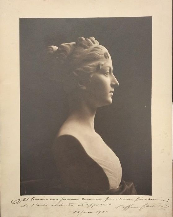 Fotografia in bianco e nero di cm 18x24 su cartoncino di cm 23x29. Al piede dedica, data e firma. Condizioni : USATO - Stato : Buono. Altre note : Carlo Fait (Rovereto, 8 gennaio 1877 – Torino, 11 marzo 1968) è stato uno scultore italiano. Dopo un apprendistato presso i marmisti Scanagatta di Rovereto si iscrive alla Scuola di ornato di Trento e in seguito al corso preparatorio dell'Accademia di Brera a Milano nel 1897. Interrompe ben presto gli studi per dedicarsi all'apprendistato presso gli scultori della città , in seguito Pietro Canonica lo chiama nel proprio studio di Torino. Nel 1908 completa il busto in bronzo di Clementino Vannetti per la città di Rovereto. All'inaugurazione, nel maggio dello stesso anno, è presente anche Cesare Battisti. Nel 1912 Fait collabora con Canonica agli altorilievi del monumento equestre al granduca Nikolaj NikolaeviÄ? Romanov, che viene posto nella piazza Manejnaja di Pietroburgo. Nello stesso anno compie con il maestro un viaggio a Roma, dove può osservare le opere scultoree dell'antichità . Dopo una lunga e proficua carriera, culminata nel 1934 con l'esposizione dei busti di Giovanna d'Arco e di Giovanni Bosco al Salon di Parigi, a causa di screzi con il Canonica ritorna a Rovereto e nel 1937 decide di donare parte della sua opera al Museo civico della città . Nel frattempo i committenti cominciano a diradarsi anche a causa di un' improvvisa sordità e di una salute sempre più cagionevole. Fait dedica allora tutte le sue energie alla creazione dell'opera La preda, ideata nel 1934 e ispirata al ratto di Proserpina. Nel 1944 trova un committente, ma tre anni dopo l'incarico gli è revocato per motivi economici. Nel 1949 realizza La pace a Trino, nel 1948–1951 il busto di Luigi Zandonai a Rovereto.Trascorre gli ultimi vent'anni della sua vita in cattive condizioni economiche e di salute, sempre alla ricerca di un acquirente per La preda. Muore a Torino l'11 marzo 1968.