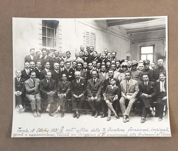 Trento, 18 ottobre 1931 A -IX- nell'ufficio della R. Questura funzionari, impiegati, agenti e rappresentanze, riuniti per festeggiare il VI anniversario della fondazione del Corpo; I Commissari di P.S. a Trento -il 18 ottobre 1932 ; Nella Regia Questura, Trento 18 Ott 1932 Anno -X-.