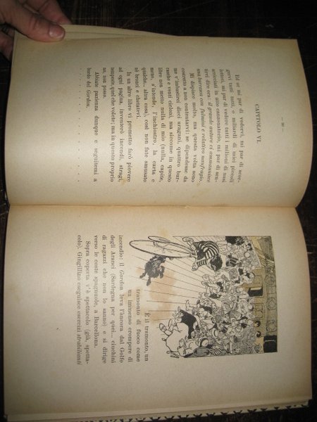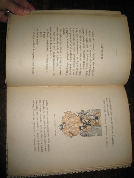 In-8°, pp. 206, (1), cartonatura decorata. Ritratto del Piccioni in antiporta. Illustrazioni a colori e in b.n. di Mussino n.t. Dedica a stampa ad Alberto Cioci. Buon esemplare. Seconda ristampa (la prima edizione è del 1903) di questi immaginari viaggi in velocipede di un ragazzo attraverso il mondo. Scappato da Roma in bicicletta, Gingillino vi fa ritorno al termine di un avventuroso viaggio che lo ha condotto, con molteplici mezzi di locomozione (oltre al velocipede un transatlantico, un automobile elettrica e alcuni bizzarri aerostati), in molti paesi di tutti i continenti: Buenos Aires, Mendoza, Valparaiso, Santiago, Isola Palaos, Filippine, Bombay, Aden, il deserto del Sahara, l'Egitto, ecc. Momus, o Augusto da Foligno, al secolo Augusto Piccioni (Foligno, 1874-Grosseto, 1926) fu fecondo autore di libri per l'infanzia (tra cui la 'pinocchiata ' 'Il cugino di Pinocchio') e direttore del giornale per bambini 'Pinocchio'. Nato a Torino nel 1878, Attilio Mussino collaborò sin da studente a giornali satirici come La Luna e Il fischietto. Collaboratore del 'Corriere dei Piccoli', fu apprezzatissimo autore di fumetti ed illustratore di volumi, àmbito nel quale il 'Pinocchio' resta indubbiamente il suo capolavoro. Morì a Cuneo nel 1954.