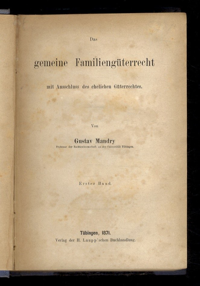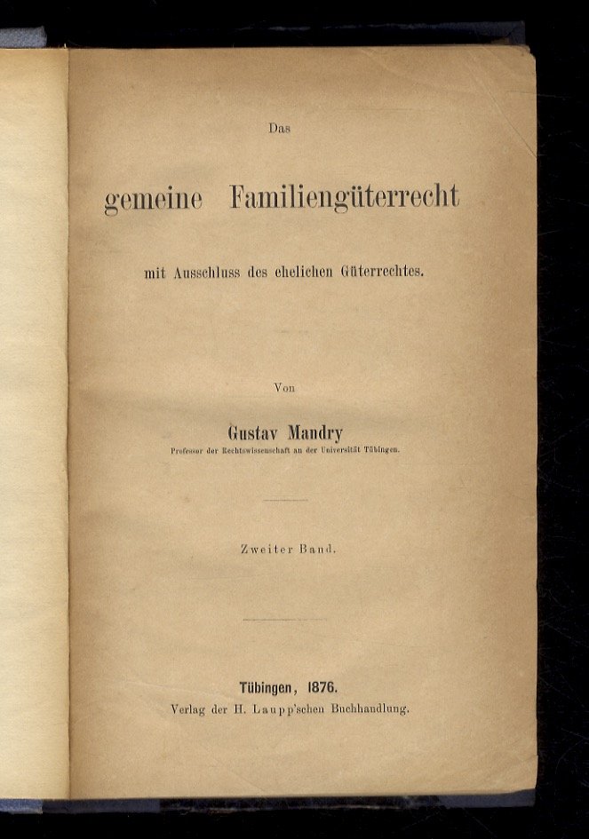 Tübingen, H. Laupp, 1871 - 1876, volumi 2, in-8, legatura di poco successiva in mezza tela azzurra con angoli, tassello in pelle con iscrizioni in oro al dorso, pp. XVII, 524 - X, 622. Ex-libris di Filippo Vassalli, uno dei massimi esperi italiani di diritto matrimoniale. Condizioni molto buone.