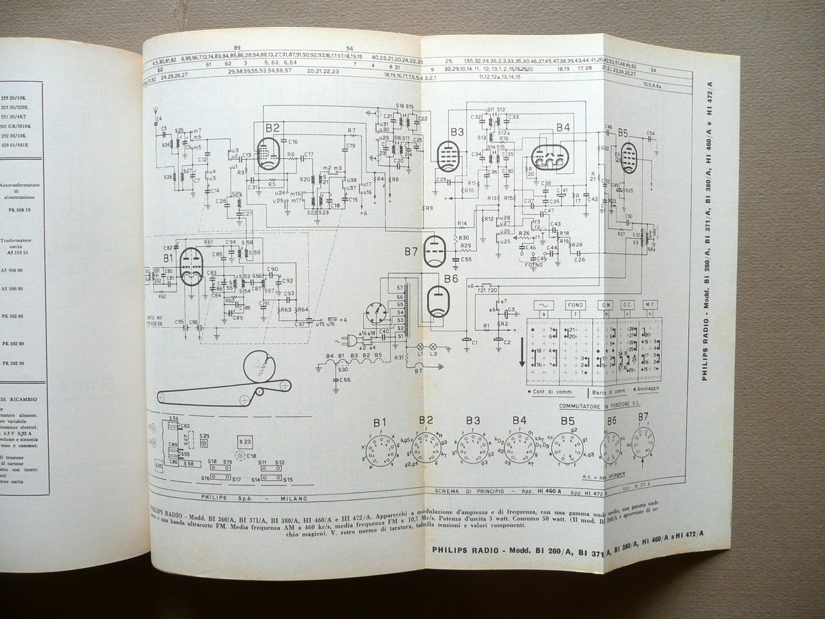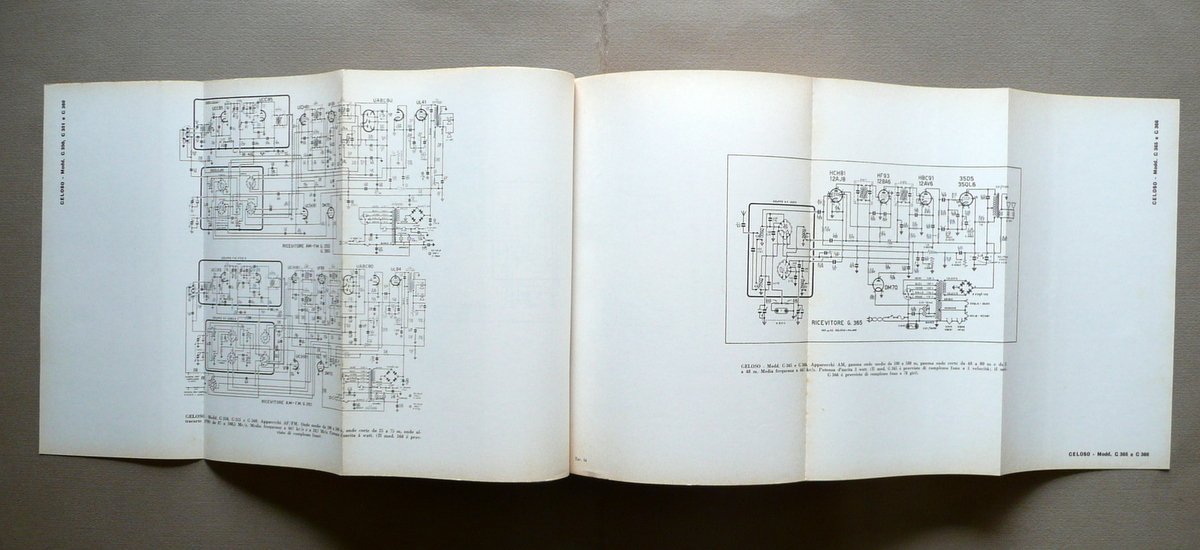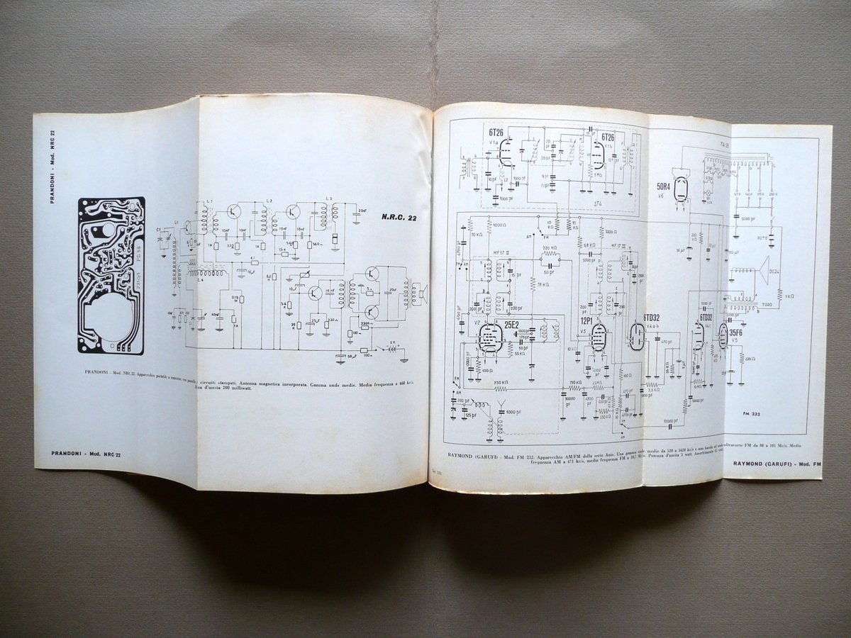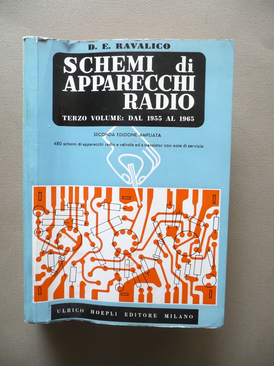 D. E. Ravalico, Schemi di apparecchi radio Volume terzo raccolta di schemi di apparecchi radio di produzione commerciale, costruiti o importati in Italia, nel periodo 1955-1965 Seconda edizione ampliata 480 schemi di apparecchi radio a valvole ed a transistor con note di servizio Hoepli, Milano 1969; cm 24,5x17,5; 480 schemi in b/n, la maggior parte dei quali ripiegati (vedi foto); brossura ed. ill. a colori con bandelle. solo volume terzo. Condizioni di conservazione Esemplare ben conservato con tracce d'uso, brossure con qualche minima abrasione e alcuni piccoli difetti ai margini, angoli e cuffie; pressoché trascurabili tracce di sporco. Interni buoni con qualche piccola lieve brunitura alla prima e all'ultima pagina. Solo volume terzo, che contiene 480 schemi in bianco e nero, la maggior parte dei quali ripiegati (vedi foto). Gli schemi sono relativi ad apparecchiature radiofoniche di varie importanti case produttrici: Geloso, Braun, Grundig, Philips, Saba Italia, Unda Radio, Phonola, Blaupunkt, ecc. SETT136.L13388 N