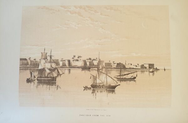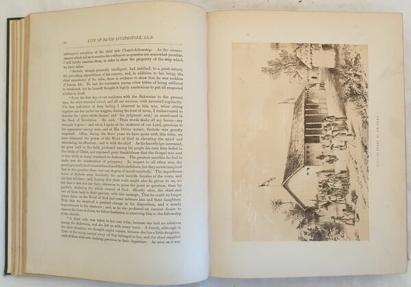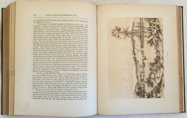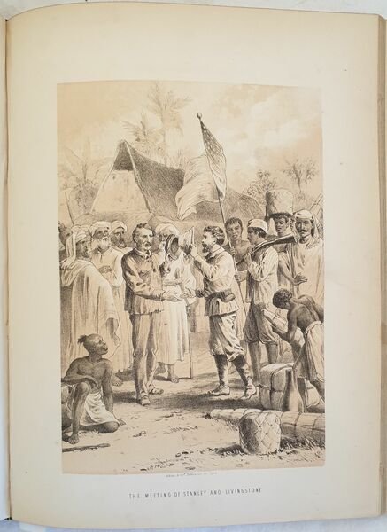 Bella edizione londinese del 1875 circa della vita dell'esploratore e medico inglese David Livingstone (1813 - 1873). Medico missionario, è considerato come uno dei più grandi esploratori del continente africano. Il testo è impreziosito da 19 tavole litografiche in bianco e nero, antiporta colorata a mano e frontespizio figurato. Le vedute rappresentano il dottore e le sue esplorazioni, nativi indigeni, e animali africani, scene storiche: Stanley incotnra Livingstone, Table Mountain del Capo di Buona Speranza, Kwirara, Lago Ngami, Cascate Victoria nello Zambesi, Lago Victoria Nyanza, Zanzibar dal mare, St Paul de Loanda, Cascate Murchinson. In ottime condizioni. Copertina in mezza pelle con titolo in oro e data 1872 al dorso in ottime condizioni con lievi usure ai margini e dorso. Legatura in buone condizioni. Pagine in ottime condizioni con rare fioriture. In 4. cm. 30,5x24,5. Pp. VIII+632.Contents: [VIII+632]. In 4 (12 x 9.65 in; 305 x 245 mm) Weight Kg. 2,720. 19 sepia lithographic plates. Lithographic frontispiece coloured by hand and decorated title page. Not dated but 1875 circa Condition of contents: Very good conditions. Occasional foxing. Condition of binding: Half leather cover with golden title and date 1872. Superbly illustrated biography of David Livingstone with 21 lithographic views of the doctor on his explorations, the native people and animals of Africa, Stanley meeting Livingstone, Table Mountain Cape of Good Hope, Kwirara, Lake Ngami, Victoria Falls of the Zambesi, Lake Victoria Nyanza, Zanzibar from the Sea, St Paul de Loanda, Murchinson Falls. David Livingstone (1813 - 1873) was a British physician, Congregationalist, and pioneer Christian missionary with the London Missionary Society, an explorer in Africa, and one of the most popular British heroes of the late 19th-century Victorian era. He had a mythical status that operated on a number of interconnected levels: Protestant missionary martyr, working-class "rags-to-riches" inspirational story, scientific investigator and explorer, imperial reformer, anti-slavery crusader, and advocate of commercial and colonial expansion.