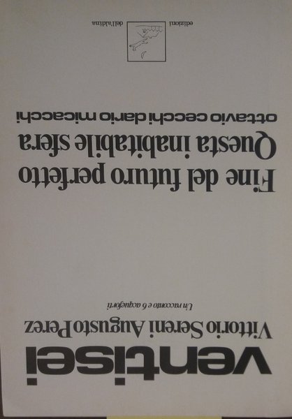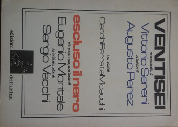 RACCONTO INEDITO DI VITTORIO SERENI E SEI INCISIONI DI AUGUSTO PEREZ CON TESTI CRITICI DI CECCHI - FERRATA - MICACCHI - ESCLUSO IL NERO. OTTO POESIE E UNA PROSA INEDITE DI EUGENIO MONTALE CON SEI INCISIONI A COLORI DI SERGIO VACCHI. Placchetta di presentazione della collana dell'Aldina. In 8vo, cm. 15,5x21h; pag. 48 non numerate, con una riproduzione fotografica di un foglio del dattiloscritto originale del racconto, un ritratto fotografico in bianco e nero dell'autore, il testo critico di Ottavio Cecchi su Sereni, 6 riproduzioni di tavole di Augusto Perez e un testo di Dario Micacchi sull'artista. Per Montale il volume riproduce un ritratto fotografico in bianco e nero dell'autore, la riproduzione fotografica del testo originale di una poesia di Montale, una poesia inedita di Montale, un ritratto fotografico in bianco e nero di Sergio Vacchi, 4 tavole in bianco e nero e 2 a colori dell'artista. Brossura editoriale con bandelle. Ottima la conservazione. Codice inv.1030112