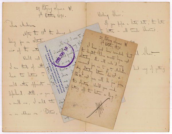 (Small) 8vo. Altogether (1½+1+1 =) 3½ pp. on 4 ff. To John Henderson, Secretary of the National Liberal Club. I: "[.] Would next Saturday be too sudden? I can think of nothing better, although I have two lectures to give on Saturday, + would rather appreciate an evening's rest beforehand. Still, as you say your room is a small one, I could take matters quietly in an address on 'Politics, Tory, Liberal + Working Class' [.]" (October 8, 1890). - II: "I have just been reminded that the Chrystal Palace concerto begins next Saturday. This will make it very inconvenient for me to go to Harlesden [.]" (October 9, 1890). - III: "No: if I were to add . chairtaking to my platform activities, it would finish me altogether. Besides, it is very bad economy for the Circle to waste a star speaker on the chair. It is hard enough to get him one; and when you do, you had better got the whole evening out of him [.]" (December 20, 1922). - Accompaned by a typed letter signed by Shaw's secretary, Blanche Patch.