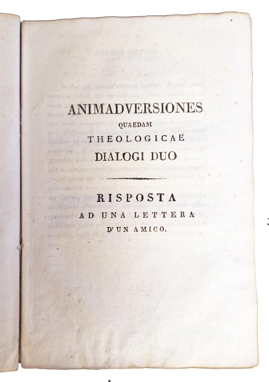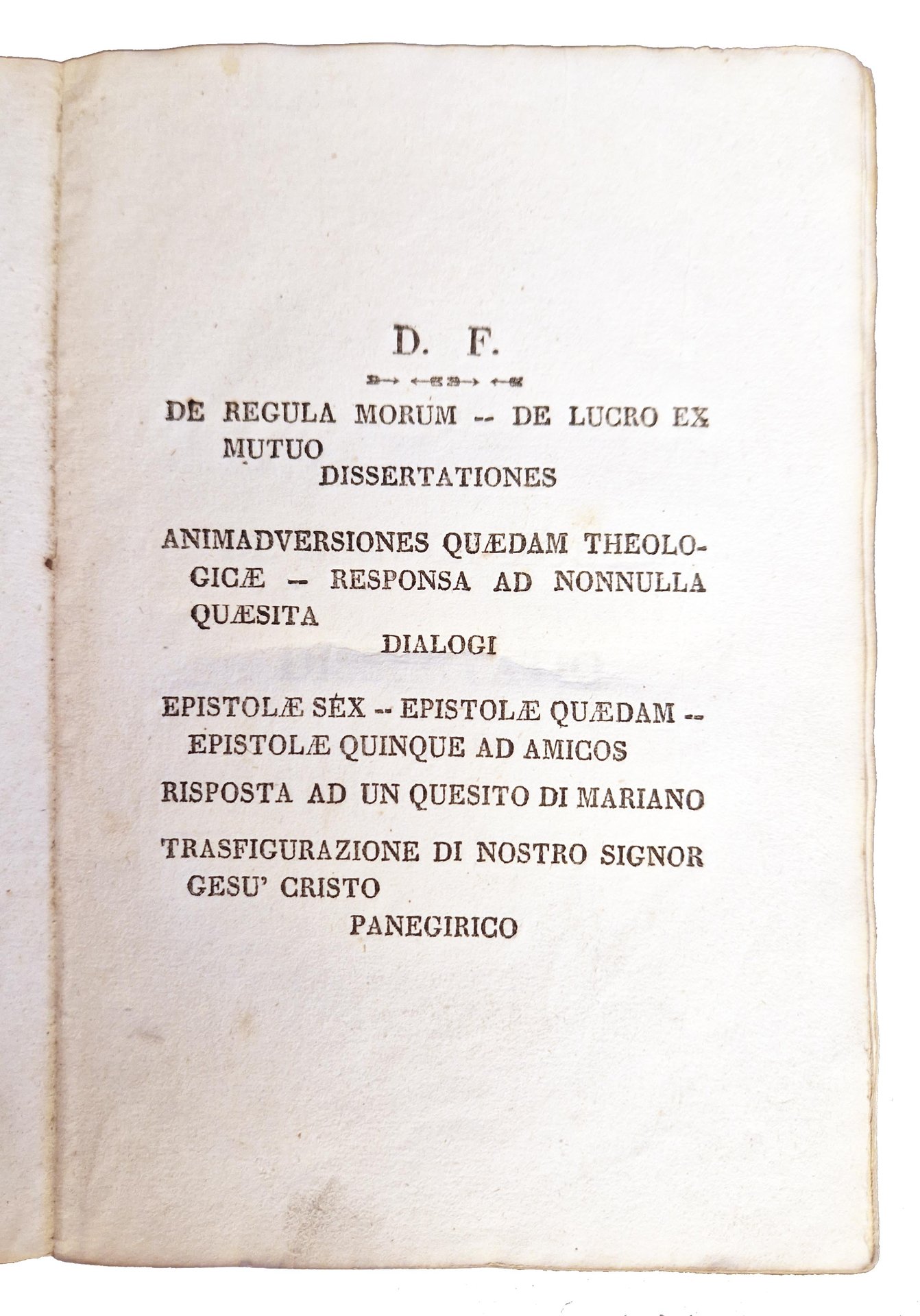 [1.]: De regula morum dissertatio. [2.]: De lucro ex mutuo dissertatio. [3.]: Animadversiones quaedam theologicae dialogi duo. [4.] Responsa ad nonnulla quaesita dialogi. [5.]: Epistolae sex ad amicos - Epistolae quaedam - Epistolae quinque ad amicos. Risposta ad un quesito di Mariano. [6.]: Trasfigurazione di nostro Signor Gesù Cristo Panegirico.