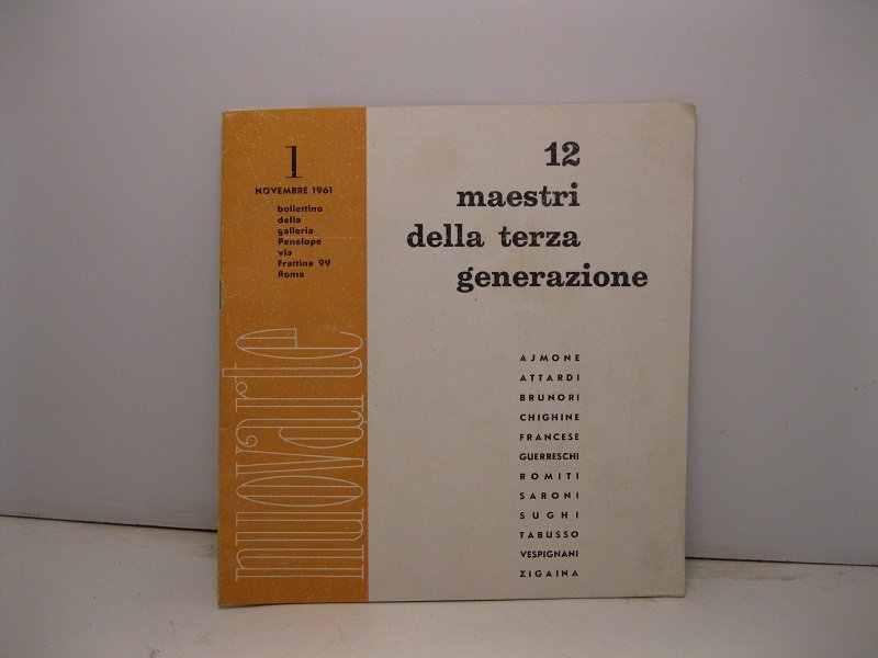 In 8, pp. 16 con riproduzioni di opere in b/n. Br. ed. Bollettino della galleria Penelope di Roma. Presentazione dei 12 artisti Ajmone, Attardi, Brunori, Chighine, Francese, Guerreschi, Romiti, Saroni, Sughi, Tabusso, Vespignani, Zigaina con testi di Alberto Martini, Renato Guttuso, Giovanni Carandente, Mario De Micheli, Alberto Busignani, Mario Valsecchi, Luigi Carluccio, Marcello Venturoli.