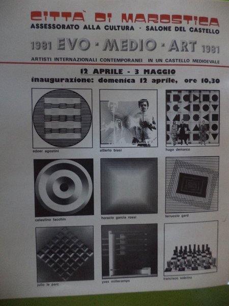 Catalogo mostra città di Marostica, Salone del Castello, 12 aprile - 3 maggio 1981, opere di: Agostini, Biasi, Demarco, Gard, Garcia Rossi, Le Parc, Millecamps, Sobrino, legatura a punto metallico, formato 21x21, pagine 44, illustrato in nero, ottime condizioni - 18962