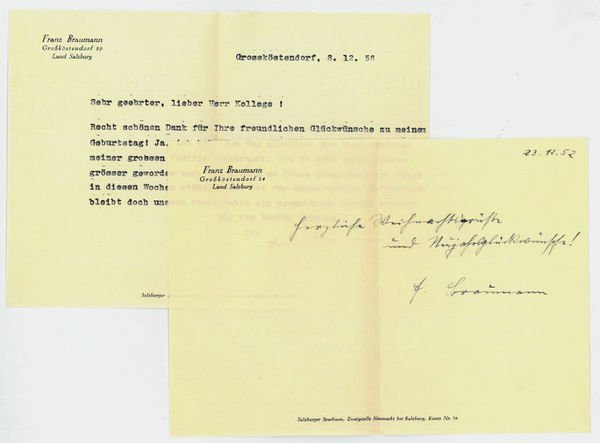 Zusammen 2 SS. Qu.-8vo. Mit 2 (1 eh. und 1 ms.) Kuverts. Dankt Josef Wesely für ihm übersandte Geburtstagswünsche und wünscht seinerseits das Beste zum Neuen Jahr. - Franz Braumann schrieb zahlreiche Romane, Erzählungen sowie Kinder- und Jugendbücher; 1958 wurde ihm der Österreichische Staatspreis für Jugendliteratur verliehen. Vgl. Kosch I, 903f. - Auf Briefpapier mit gedr. Briefkopf.