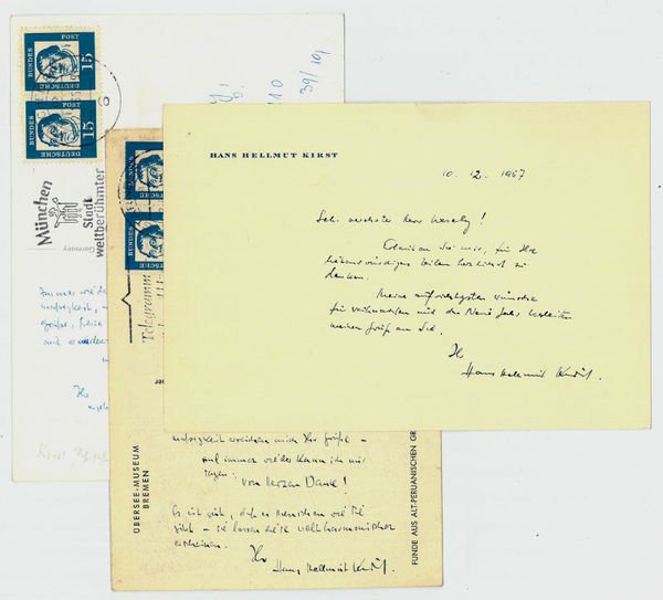 8vo. 3 pp. With an autogr. envelope. Collection of postcards to the collector Josef Wesely. - The prolific Kirst was one of Germany's most successful novelists of the post-war period and the first German member of the American "Author's Guild".