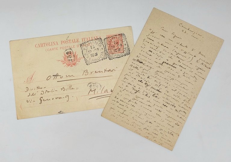 >2 cartoline postali, Carte postale d'Italie (mm 90x140) con tibro postale indirizzate a “Ottoni Brentani”. Il mittente delle missive è l'amico, scultore simbolista, Leonardo Bistolfi. La prima datata Torino, 15/10/16 risale al periodo in cui il Brentani era direttore della rivista Bella Italia.“Sono affranto da un cumulo enorme di lavoro e di preoccupazioni ed anche di cose più difficili mi riescono spesso impossibili…” La seconda datata 27/08/26 risale al periodo in cui il Brentano collaborava come giornalista de il Corriere della Sera. “Con un ritardo di due giorni mi ha raggiunto quassù una lettera (espressa) Di Alberto G. invitandomi a seguire la comitiva che domani andrà al Maloja a portare il nostro saluto al povero e grande amico nostro”. Ben conservate